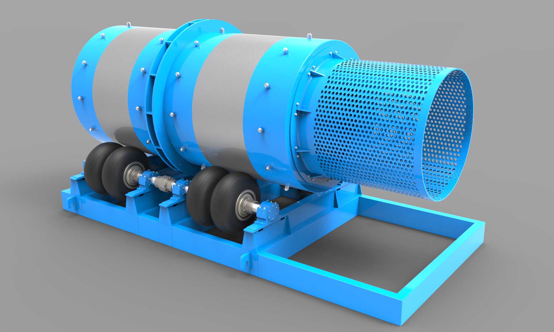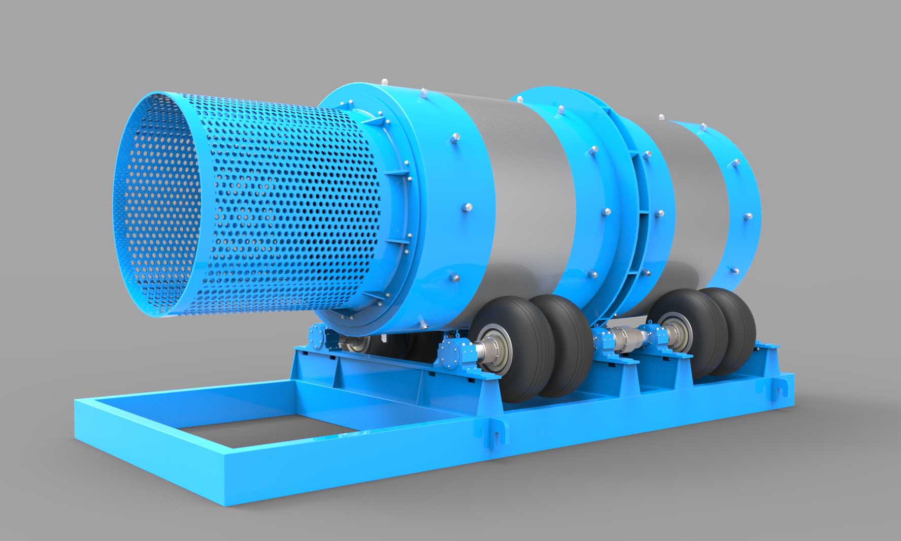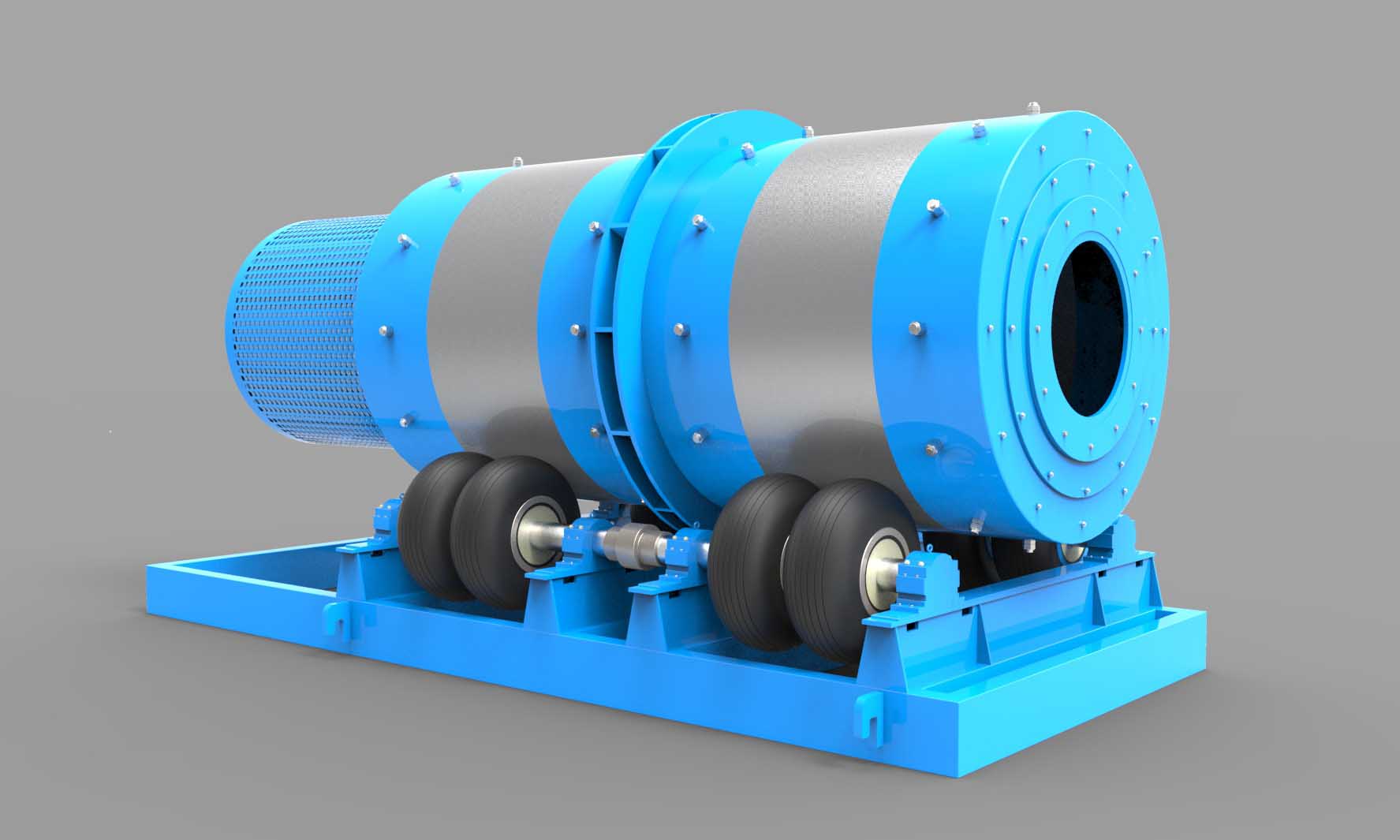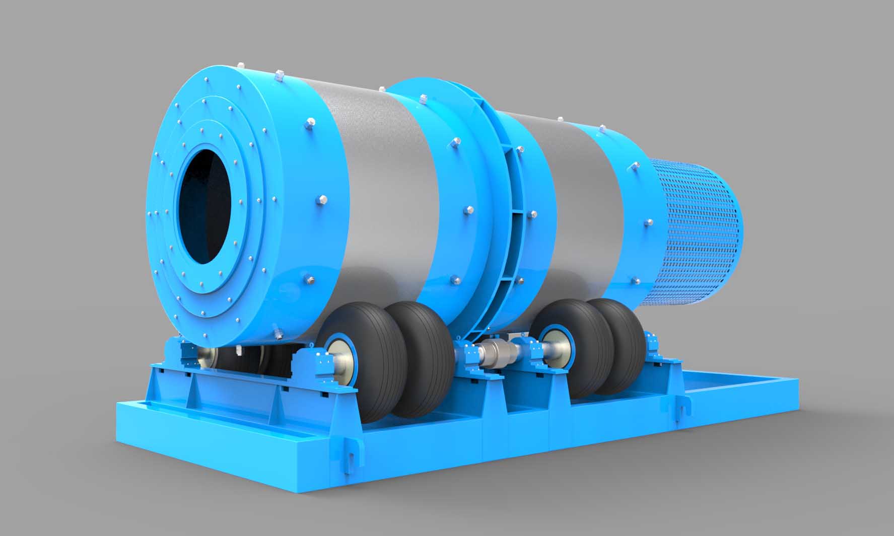 筒體采用特殊焊接工藝、超聲波探傷檢 查,并退火處理。大、小齒輪均采用合金鋼,經(jīng)多道工序達(dá)到耐磨、耐沖擊的效果。端蓋結(jié)構(gòu)為 適合鋼渣處理的新式結(jié)構(gòu),可進(jìn)大物料。筒體、端蓋、大齒輪壽命可達(dá)20年。