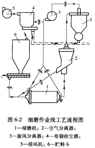 閉路循環(huán)細磨作業(yè)線中(圖6—2),除球磨機外,還包括:粗粒分離用的字氣分離器、旋風分離器(大部分粉料在其中沉降并從中排出)、對氣流進行最后除塵用的布裳收塵器以及排風機。