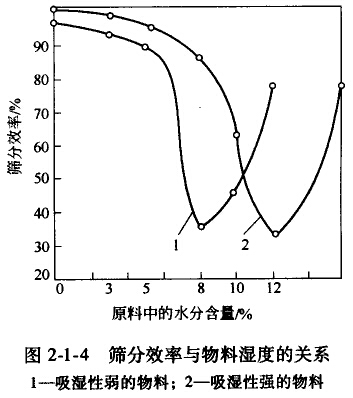 水分對某種物料的篩分過程的具體影響,只能根據(jù)試驗(yàn)結(jié)果判斷。篩分效率與物料濕度的關(guān)系見圖2-1-4。圖中,兩種物料所受酌影響是不同的,產(chǎn)生差別的原因可以由這兩種物料具有不同的吸濕性能來解釋。