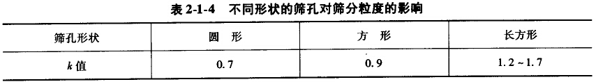 由表2-1-2中可知,原料中所含的難篩粒及阻礙粒相對其他粒級較多時(shí),對篩分過程不利:而所含的易篩粒和非阻礙粒相對其他粒級較多時(shí),對篩分過程有利。