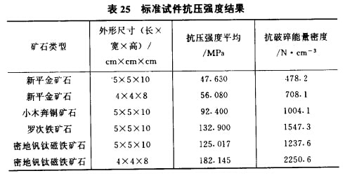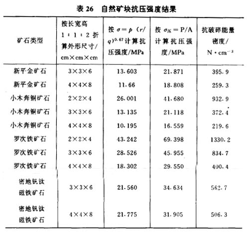 考察巖礦抗壓強(qiáng)度的整個(gè)測定過程,可以斷定所測定的標(biāo)準(zhǔn)試件抗壓強(qiáng)度比磨礦過程中自然礦塊的抗壓強(qiáng)度顯著偏大,表25 及表26的結(jié)果即是證明。表25及表26的對比結(jié)果說明,與標(biāo)準(zhǔn)試件重量或折算外形尺寸基本相同的自然礦塊的抗壓強(qiáng)度僅為標(biāo)準(zhǔn)試件的20%~30%。其原因在于,首先,在試樣挑選過程中,強(qiáng)度低的巖礦一般不被選擇;其次在制備標(biāo)準(zhǔn)試件的過程中,一些強(qiáng)度低的試樣也因鋸磨加丄等原因破裂;更重要的是標(biāo)準(zhǔn)試件的受壓面要磨平,以防止在測定過程中出現(xiàn)應(yīng)力集中現(xiàn)象,而自然礦塊的破碎則是高度應(yīng)力集中。顯然,自然礦塊的抗壓強(qiáng)度更有代表性及實(shí)用性,因?yàn)槟サV過程中鋼球與礦石之間為點(diǎn)接觸,破碎過程中的應(yīng)力集中現(xiàn)象很普遍。