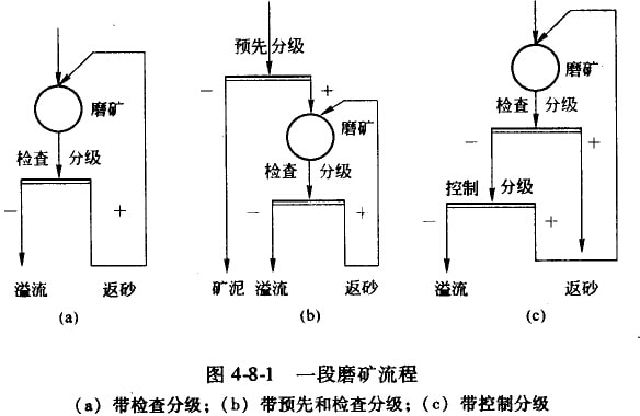 采用一段磨礦流程時,磨礦機(jī)開路工作容易產(chǎn)生過粉碎現(xiàn)象。通常,磨礦機(jī)都是與分級機(jī)構(gòu)成閉路循環(huán),常用流程有以下三種,如圖4-8-1所示。