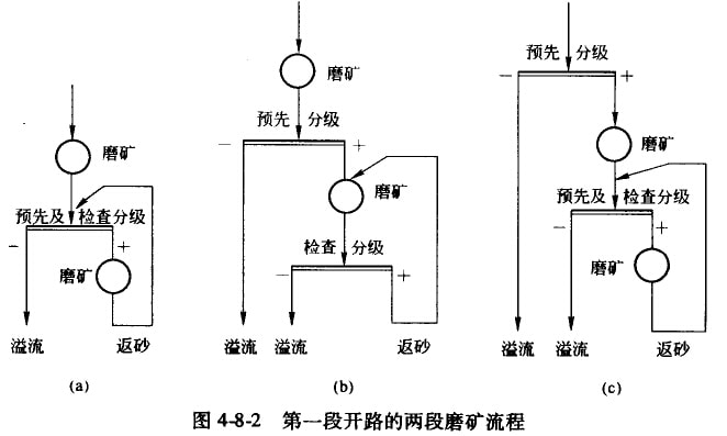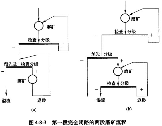 為了得到較細(xì)的磨礦產(chǎn)物以及需要進(jìn)行階段選別時,經(jīng)常采用兩段磨礦流程。進(jìn)行階段選別時,第一磨礦段的產(chǎn)物進(jìn)入第一段選別,選得精礦,其尾礦或中礦(有時可能是混合精礦或粗精礦)經(jīng)第二段磨礦后,再進(jìn)入第二段選別。