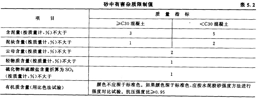 國標JGJ52-92中對砂中有害雜質含量的規(guī)定見表5.2。