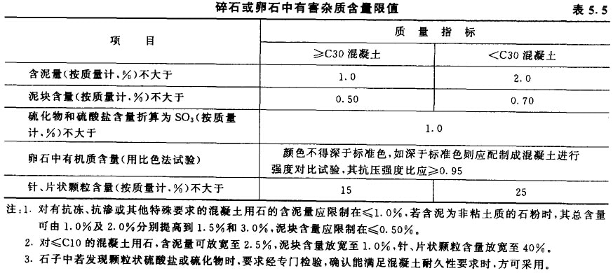 粗骨料中的有害雜質,主要有粘土、淤泥、有機質、硫化物及硫酸鹽等。它們的危害作用與在細骨料中的作用相同,它們的允許含量應符合表5.5的規(guī)定。