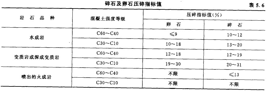 對多種巖石組成的卵石,可對20mm以下和20mm以上的標準粒級(10-20mm)分別檢驗,計算總的壓碎指標。碎石及卵石的壓碎指標見表5.6。