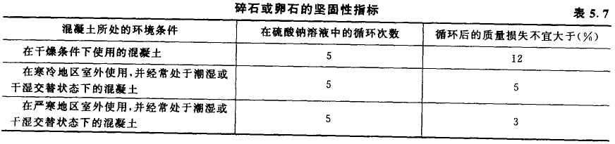 石子的堅固性是指石于在氣候、環(huán)境變化或其他物理因素作用下,抵抗碎裂的能力。常用硫酸鈉溶液,將試件經5次循環(huán)浸泡后,要求試件質量的損失應符合表5.7的規(guī)定。質量損失越少,骨料越堅固,其質量也越好。