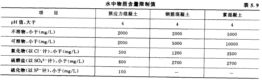 對水質有懷疑時,應將待檢驗水與蒸餾水分別做水泥凝結時間和砂漿或混凝土強度對比試驗。對比試驗測得的水泥韌凝時間差和終凝時間差,均不得超過30min,且其韌凝及終凝時間應符合國家水泥標準的規(guī)定。用待檢驗水配制的水泥砂漿或混凝土的28d抗壓強度不得低于用蒸餾水配制的對比試件強度的90%;炷劣盟懈鞣N物質含量限制值見表5.9。