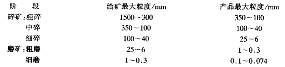 由于采礦方法、運(yùn)輸條件及選礦廠規(guī)模的不同,送到選礦廠來的原料粒度也不同。目前井下開采的礦石最大塊度為200~600 mm,而露天開采的礦石最大塊度則為1200~1500 mm。選別作業(yè)所要求的入選粒度往往都很細(xì),通常在0.3 mm以下。目前所用的碎礦和磨礦設(shè)備,由于構(gòu)造上的原因,所能處理的給礦粒度和產(chǎn)品粒度,都有一定范圍,因此不可能一次就把粗大的礦塊粉碎到所要求的入選粒度。所以必須通過若干臺(tái)不同型式的碎礦和磨礦設(shè)備,逐段進(jìn)行處理,而每段只完成整個(gè)粉碎過程的一部分任務(wù)。在選礦廠中"段"是根據(jù)所處理的入料和產(chǎn)品的粒度來劃分的。一般分為兩個(gè)大的階段,即碎礦階段和磨礦階段(統(tǒng)稱為粉碎段),碎礦采用兩段或三段,磨礦采用一段或兩段。各段的大致粒度范圍為:
