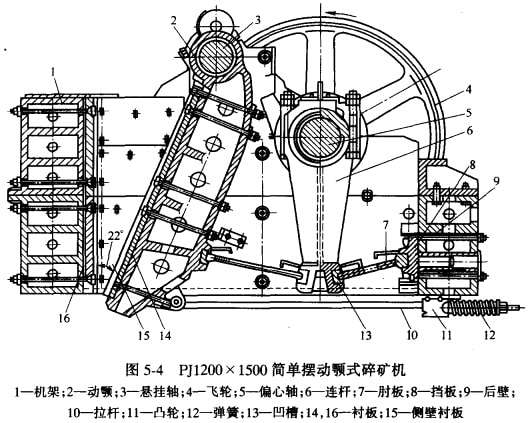 圖5-4是我國(guó)生產(chǎn)的PJ1200X 1500簡(jiǎn)單擺動(dòng)顎式破碎的剖視圖。這種碎礦機(jī)主要是由機(jī)架和支承裝置,碎礦的工作機(jī)構(gòu),傳動(dòng)機(jī)構(gòu),保險(xiǎn)裝置及排礦口調(diào)整裝置等幾部分組成。