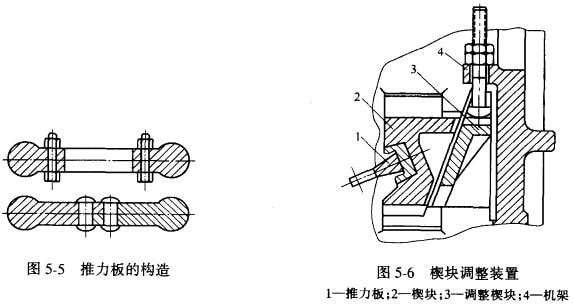 推力板又稱(chēng)肘板,它是向動(dòng)顎傳遞運(yùn)動(dòng)的一個(gè)桿件,同時(shí)用它作為保險(xiǎn)裝置。改變其長(zhǎng)度,還可以調(diào)整排礦口的大小。一般用鑄鐵鑄成整體,也有鑄成兩塊的,然后用螺栓或鉚釘連接起來(lái)。也有將肘頭和肘身分開(kāi)制造,如圖5-6所示,然后用媒栓或鉚釘連接起來(lái)。