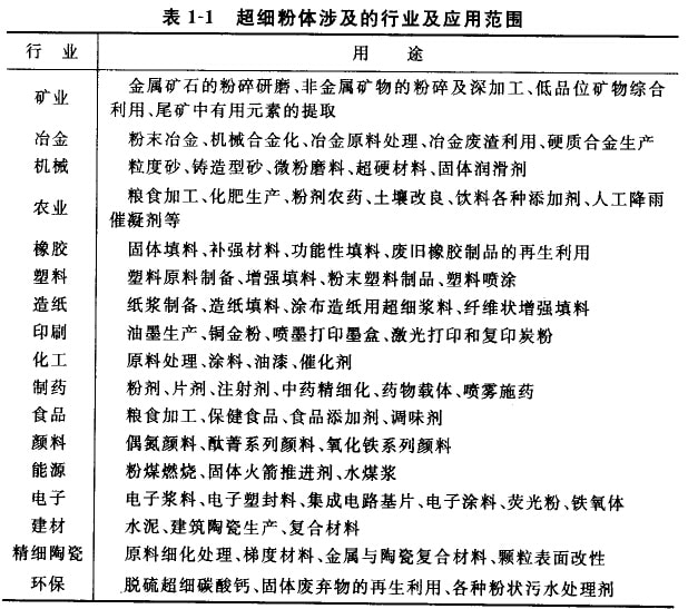 超細(xì)粉體工業(yè)是多學(xué)科的組合,超細(xì)粉體幾乎應(yīng)用于國(guó)民經(jīng)濟(jì)的所有部門,表l-l為超細(xì)粉體涉及的行業(yè)及應(yīng)用范圍。