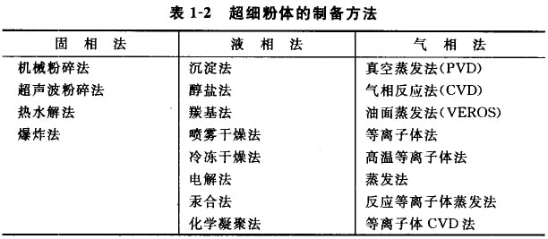 因?yàn)槌?xì)粉體具有優(yōu)良的性能和廣泛的用途,所以人們研制了許多的制備方法。主要制備方法見(jiàn)表1-2。