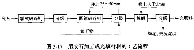 圖3-17所示為以破碎廢石作為井下膠結(jié)充填骨料的工藝流程。加工廢石先經(jīng)600mmx900mm顎式破碎機(jī)粗碎,粗碎產(chǎn)品經(jīng)1250mmx2500mm慣性振動(dòng)篩分機(jī)分級(jí)后,大于50mm的篩上產(chǎn)品者再經(jīng)標(biāo)準(zhǔn)圓錐破碎機(jī)破碎后再經(jīng)1250mmx2500mm慣性振動(dòng)篩分機(jī),25-50mm篩分產(chǎn)品作為成品碎石,可作為混凝土膠結(jié)骨料或水砂充填用。小于25mm的篩下產(chǎn)物進(jìn)一步用棒磨機(jī)細(xì)磨,磨后用篩分機(jī)分級(jí),-3mm+37μM的粒級(jí)為成品砂,可供膠結(jié)充填作細(xì)骨料之用,-37μM以下的細(xì)泥丟棄,排入尾礦壩。