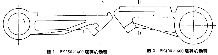 據(jù)統(tǒng)計(jì)國(guó)內(nèi)大約100余家生產(chǎn)顎式破碎機(jī)的廠(chǎng)家,有些還是采用50年代從蘇聯(lián)引進(jìn)的技術(shù)生產(chǎn)破碎機(jī)。有的破碎機(jī)動(dòng)顎結(jié)構(gòu)不盡合理,使動(dòng)顎沉重而強(qiáng)度又較低,從而降低其使用壽命,浪費(fèi)原材料,例如PE250×400PE400×600顎式破碎機(jī)動(dòng)顎結(jié)構(gòu)(圖1、2)均不合理。