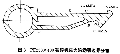 經(jīng)動(dòng)顎結(jié)構(gòu)有限元分析,求得應(yīng)力沿動(dòng)顎邊界分布如圖3所示。從圖中看出,在肘座附近A、B、C三點(diǎn)應(yīng)力最大,故動(dòng)顎常在此處損壞,而D、E、F三點(diǎn)應(yīng)力較小,且與前三點(diǎn)應(yīng)力差值太大。