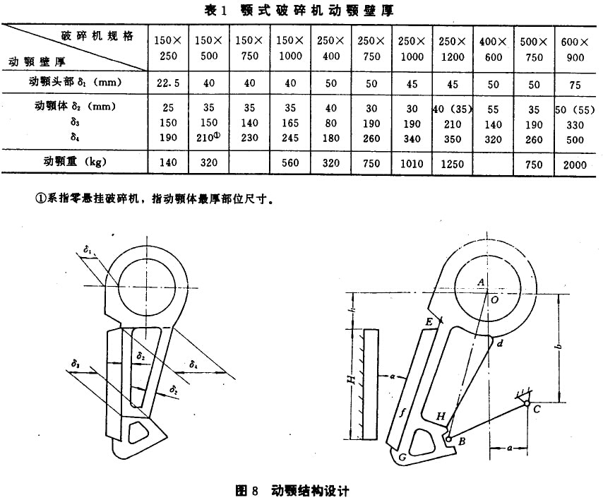 動(dòng)顎體的壁厚可根據(jù)強(qiáng)度計(jì)算并考慮剛度來(lái)選定。還可參考實(shí)際數(shù)據(jù)(表1)選定。