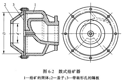 鼓式給礦器如圖6-2所示,只用于給料位置高于球磨機(jī)軸線的場(chǎng)合。它一般用于開路磨礦, 將破碎產(chǎn)品送入球磨機(jī)進(jìn)行磨碎。它由筒體1、蓋子2和帶有扇形孔的隔板3組成,三者用螺釘固定聯(lián)接。筒體由鑄鐵制成,或用鋼板焊接,在內(nèi)部有縲旋形隔板。蓋子2是截錐形短筒,左方為進(jìn)料孔。當(dāng)物料由此給入后,經(jīng)過隔板的扇形孔進(jìn)入筒體,由筒體內(nèi)部的螺旋形舉板將物料舉起,自右方送入球磨機(jī)的中空軸頸內(nèi)。這種&料器的給料粒度可達(dá)70 mm。