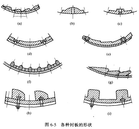 襯板的形狀多種多樣,如圖6-5所示。按其表面形狀可分為平滑和不平滑兩類。不平滑襯板可使磨礦介質(zhì)提升到較髙的高度再落下,并且對(duì)鋼球和礦石有較強(qiáng)的攪動(dòng),因而適用于粗磨。平滑襯板由于鋼球與襯板之間的相對(duì)滑動(dòng)較大,因而產(chǎn)生較多的研磨作用而適用于細(xì)磨。