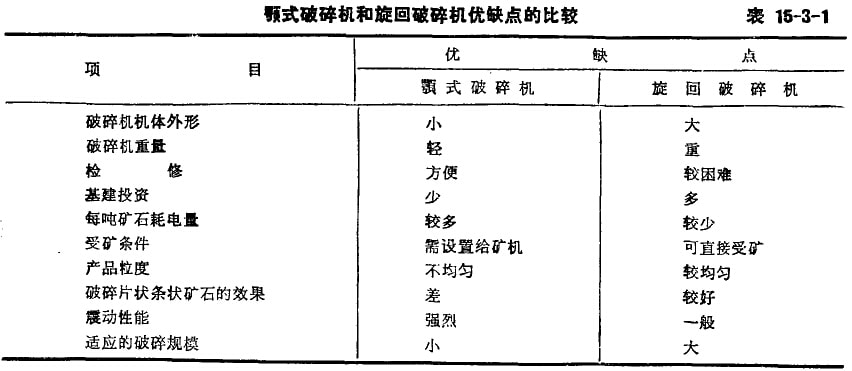 露天礦所用的粗破碎設(shè)備,一般都采用顎式破碎機(jī)或旋回破碎機(jī)。所選用的設(shè)備,必須滿足破碎產(chǎn)品粒度和生產(chǎn)能力的要求,也需考慮給礦中的最大粒度不得大于被碎機(jī)給礦口的0.85倍。顎式破碎機(jī)和旋回破碎機(jī)又各有其優(yōu)缺點(diǎn),故在選擇設(shè)備時(shí)還要根據(jù)具體情況而定,一般礦山規(guī)模較小時(shí)宜采用顎式破碎機(jī)。顎式和旋回的優(yōu)缺點(diǎn)比較見(jiàn)表15-3-1。