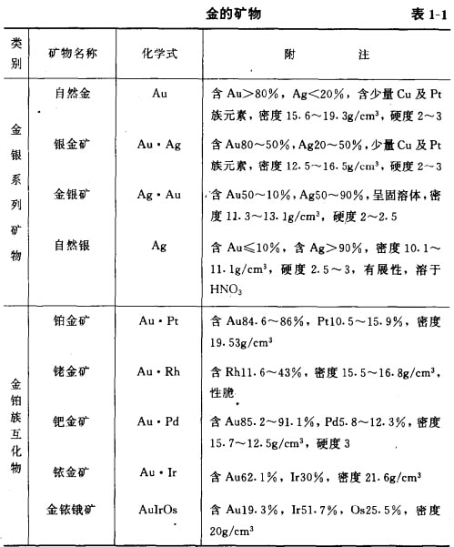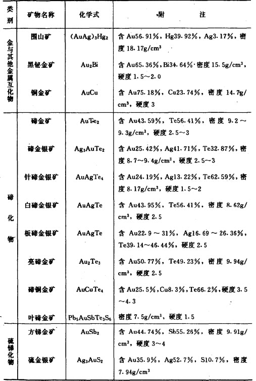 目前在自然界中已發(fā)現(xiàn)的金礦物有98種,何常見的只有47種,而工業(yè)礦物僅有十多種。最主要的是自然金、銀金礦和金銀礦具有工業(yè) 意義,其次是金的碲化物,例如碲金礦、蹄金銀礦,雖然種類較多,分布較廣,但數(shù)量不多,經(jīng)濟(jì)價(jià)值不大。已發(fā)現(xiàn)的金礦物列產(chǎn)表1-1 。