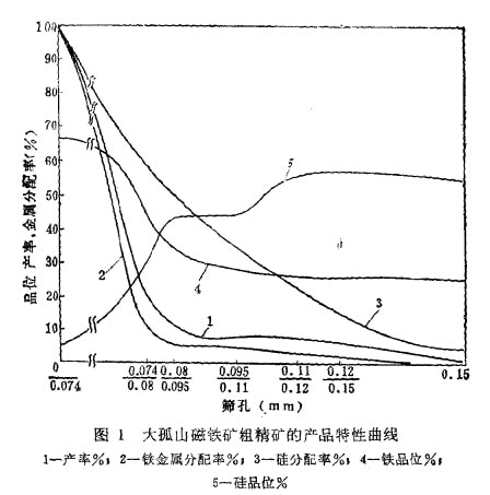 我國鐵礦資源豐富,但富礦少貧礦多。在貧鐵礦小,有用礦物以磁鐵礦為主,脈石礦物以石英為主的鞍山式磁鐵礦的量很大且分布較廣,這類礦石的儲量及)開采量約占全國鐵礦的二外之一。由于磁鐵礦性脆易磨碎,而石英較硬及韌性較大, 不易磨碎,結果在磨礦過仍小產(chǎn)今明顯的選擇性磨碎現(xiàn)象,使磨礦產(chǎn)品中磁鐵礦的粒發(fā)細,石英粒度粗;磨礦產(chǎn)品的這種粒度分布特征也反映在粗精礦中。圖1是鞍鋼大弧山選廠磁鐵礦粗精礦的產(chǎn)品粒度、品位及欽金屬分布的特性曲線。由圖可以看出,細級別合鐵高,合硅低,產(chǎn)率大;粗級別則含鐵低,含硅高,產(chǎn)率小?梢,由于選擇性磨碎作用的結果,使粗精礦在粗細兩個級別出現(xiàn)了鐵及硅的質量分離現(xiàn)象。如果選擇一個恰當?shù)谋患壏蛛x點,使可以得到質量萬同的兩個產(chǎn)品,起到分選作用。從圖l中看出,若分離點選為0.074MM(200目),用細篩將此粗精礦分成篩上及篩下產(chǎn)品,則可得到產(chǎn)率80.5%、合鐵67%、合硅30%左右及回收率88.6%的高質量鐵精礦(篩下產(chǎn)品)。長沙黑色金屬礦山設計院作過分析,采用細篩篩選再磨粗精礦,可以使鐵精礦品位提高2—3%,而每提高1%鐵品位,SiO2含量下降1.1—1.3%,焦比降低2%,高爐利用系數(shù)增加3%,渣量減少50kg左右。在不增加選礦投資、不增加選礦加工費用及不改變其他選礦指標的條件下,可使每噸生鐵成本降低1.3—1.9元,生鐵綜合投資下降3—3.7,總費用減少12—15元。如果所有鞍山式磁鐵礦選廠均采用這一措施,全國標年生產(chǎn)生鐵的總費用將下降2.5—3億元。由于這一措施簡易可行,且具有明顯的經(jīng)濟效益,所以目前我國東北及華北地區(qū)已有二十多個黑色金屬礦山安裝了2000多臺細篩投入生產(chǎn)。武鋼礦山研究所與金山店鐵礦合作,利用磁鐵礦易磨粒度細的特點,進行了細篩工藝的小型試驗及工業(yè)試驗,并獲得了好的經(jīng)濟效果:鐵精礦品位平均提高2%左右,二氧化硅含量降低5%,合硫降至0.3一0.4%以下,而鐵的回收本未受影響。一個系列(按原礦臺時產(chǎn)量116.3t計)每年可盈利22萬元左右。應指出的是,上述廠礦僅利用了選擇性磨碎現(xiàn)象,并沒有注意調節(jié)這種現(xiàn)象,如果對這種現(xiàn)象加以調節(jié),效果將更顯著。