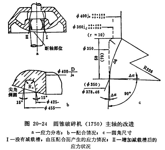 (3)在保證主軸與軀體緊配合,運(yùn)轉(zhuǎn)中不發(fā)生松動的情況下,減小主軸與圓錐軀體的配合過盈,以適當(dāng)緩和應(yīng)力集中。例如舊系列φ1650主軸用D/Jd配合;新系列φ1750破碎機(jī)改為D/j配合(圖20-24b)。