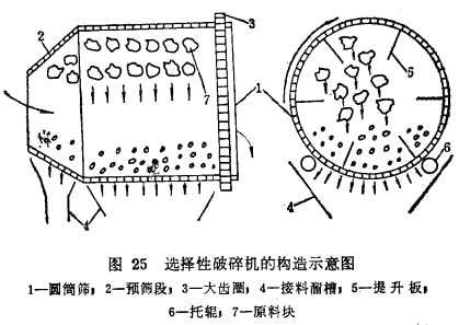 當(dāng)原煤中的凈煤和矸石的硬度有一定差異時(shí),往往采用選擇 性破碎機(jī)進(jìn)行處理。這種選擇性破碎機(jī)又簡稱選碎機(jī),因機(jī)身主體的形狀是用篩板做成的圓筒,內(nèi)裝提升板,工作時(shí)轉(zhuǎn)動(dòng),故也 叫滾筒式破篩機(jī)(見圖25所示)。選碎機(jī)早在1904年已為選煤廠 所采用,日前在許多同家的選煤廠仍得到了普遍應(yīng)用。