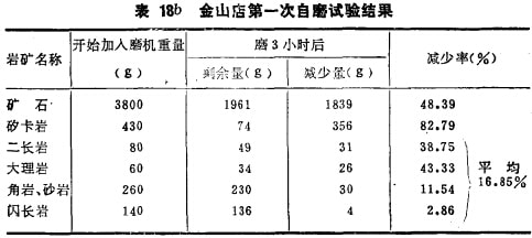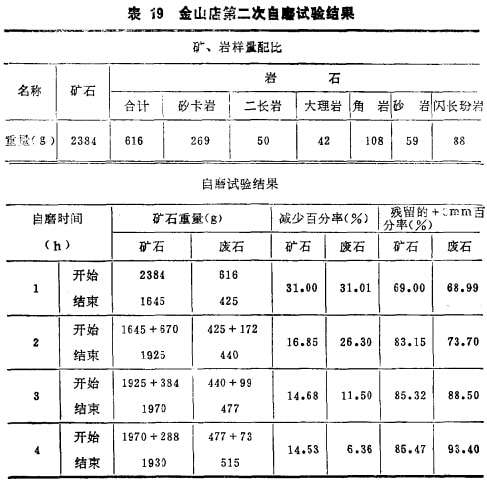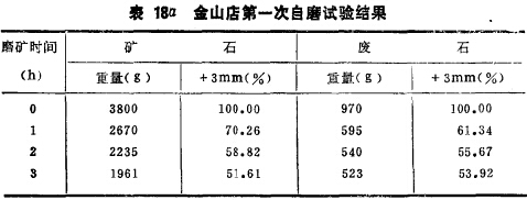 我國湖北金山店鐵礦采用濕式自磨機(jī),礦石中混入廢石較 多,且廢石比礦石難磨。為了探索礦石和廢石的可磨性,將45~ 55mm的礦石及廢石作適當(dāng)配比,用240 x 200mm錐形球磨機(jī)不加鋼球進(jìn)行自磨試驗(yàn)。每磨一小時(shí)后,將-3mm以下的粉礦排除,然后將磨機(jī)內(nèi)剩余的部分稱重。第一次試驗(yàn)的結(jié)果列于表18a、18b。由表18b看出,除矽卡巖外,其他巖石比礦石難磨,在生產(chǎn)中可能形成對(duì)自磨不利的頑石積累。第二批試驗(yàn)方法與第一批相似,但磨一小時(shí)后,將-3mm排除,然后按第一批試驗(yàn)的減少率加入大致相近的礦石與巖石量,結(jié)果列于表19。表19表明,自第三和第四小時(shí)后,礦石的減少率比廢石髙,且趨于穩(wěn)定,而磨機(jī)中殘存的+ 3mm廢石率卻愈積愈高,形成頑石積累。
