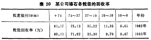 選擇性磨礦作用使某些易磨金屬礦物過磨加快,過粉碎增加,迫使采用多段磨礦多段選別的復(fù)雜流程。過磨產(chǎn)生較多的礦泥,對浮選來說,既增加藥耗又惡化浮選過程;對磁選也會惡化磁選過程;對重選影響更大,因為粒度過細重力對礦粒的影響減小,分離困難,選別指標(biāo)下降。某些錫選廠的重選生產(chǎn)實踐也表明,盡管還沒有達到過粉碎粒級界限,但粒度愈細的粒級重選的回收率也愈低,表20中列出了某公司多年來各粒級回收率的情況。從表20中可以看出,有用礦物的過磨碎對選礦的影響是非常大的。