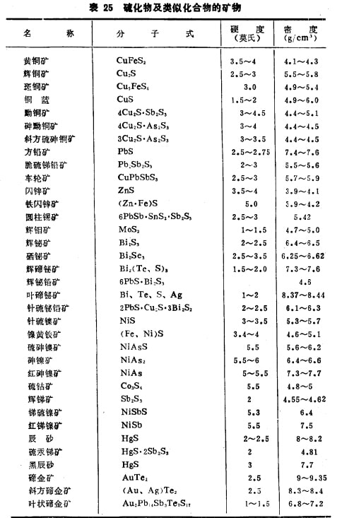 (2)硫化物及其類(lèi)似化合物類(lèi)礦物。此類(lèi)礦物多為極性 共價(jià)鍵或混合鍵聯(lián)結(jié),這是工業(yè)上有很大實(shí)際意義的一大類(lèi)礦物,共有350多種,常見(jiàn)的主要是Cu、Pb、Zn、Hg、 Ni、Co、 Mo、Cd、Bi等金屬與S、Se、Te、As形成化合物。此類(lèi)礦物的硬度一般不高,大都欠2?4之間,少數(shù)為5?6,仍密度較大,多數(shù)在4以上。常見(jiàn)的硫化物及類(lèi)似化合物如表25所列。此類(lèi)礦物由于硬度低、密度大、在磨碎時(shí)常常優(yōu)先被粉碎。這正是選礦廠(chǎng)所得精礦的平均粒度一般均比尾礦細(xì)的基本原因。