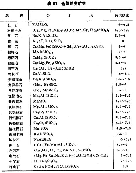 (5)含氧鹽類(lèi)礦物。這是一類(lèi)數(shù)量眾多的礦物,約占已知礦物數(shù)量的三分之二,其中包括硅酸鹽、碳酸鹽、琉酸鹽、磷酸鹽、鎢酸鹽等若干個(gè)亞類(lèi)。此類(lèi)礦物的陰離子對(duì)外部陽(yáng)離子是離子鍵結(jié)合,但陰離子內(nèi)部(即"根")卻是共價(jià)鍵結(jié)合。值得注意的是硅酸鹽礦物,一是數(shù)量大,約占已知礦物的三分之一,按重量計(jì)則占地殼重量的75%; 二是它們?yōu)橹饕鞄r曠物,是選礦的主要脈石成分,也是磨碎的主要對(duì)象;三是基本構(gòu)造單位為硅氧四面體【SiO4】, Si+4與四個(gè)頂角氧形成共價(jià)結(jié)合,故硬度很大,難磨碎。表27中列出常見(jiàn)的主要硅酸鹽類(lèi)曠物。