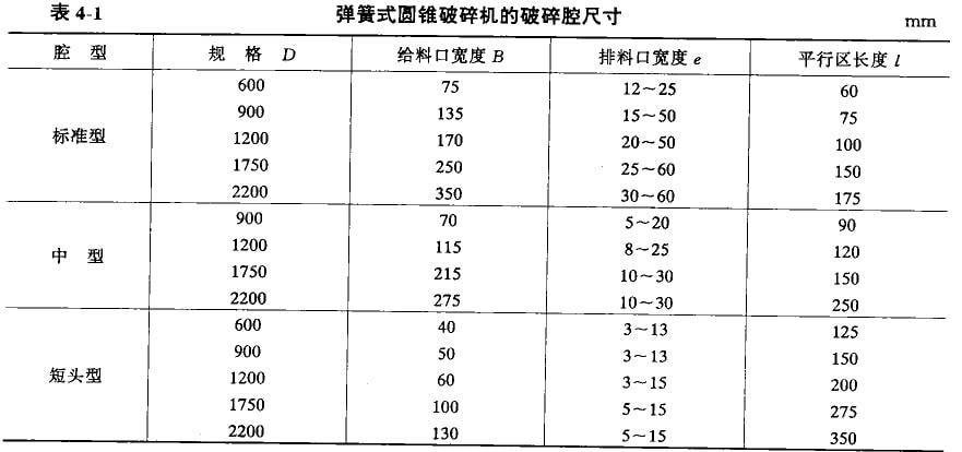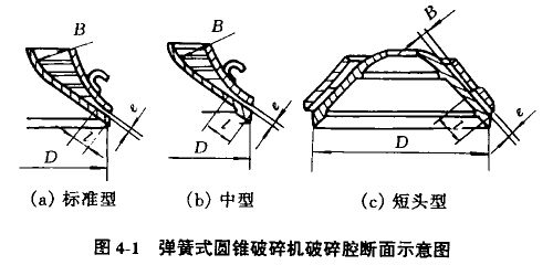 原來所用的標(biāo)記是用漢語拼音字母和動錐大頭直徑表示,如PYB2200,PYZ2200和PYc6200。其中,P為破碎機(jī),Y為圓錐,B為標(biāo)準(zhǔn)型,Z為中型,D為短頭型,2200為動錐大頭直徑(mm)。彈簧式圓錐破碎機(jī)的破碎腔斷面形狀,如圖4-1所示。其破碎腔尺寸見表4-1。