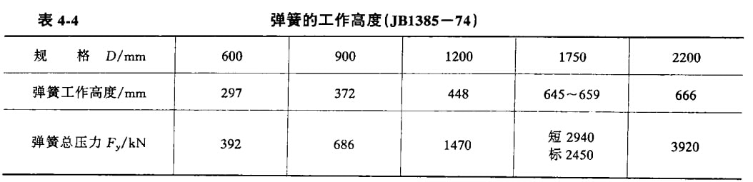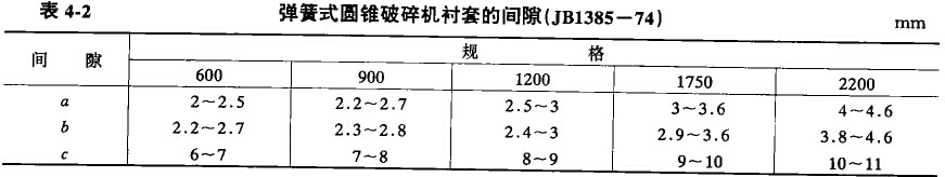 安裝在機(jī)架周圍的彈簧6是破碎機(jī)的保險裝置。當(dāng)破碎腔中掉入非破碎物時,支承在彈簧上的支承環(huán)和調(diào)整環(huán)力求向上抬起而壓縮彈簧6,從而增大了排料口間隙,使非破碎物經(jīng)排料口排出,避免機(jī)件破壞。彈簧的張緊程度對機(jī)器的正常工作具有很大的意義。在擰緊彈簧時,應(yīng)考慮到使其留有一定的壓縮裕量。破碎機(jī)每組彈簧壓縮后的工作高度見表4-4。