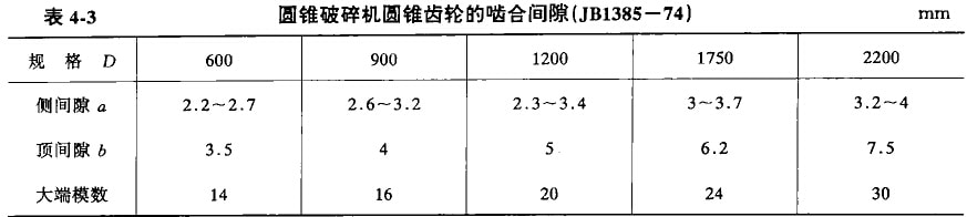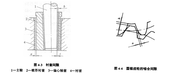 偏心軸套31支承在由三片圓盤組成的止推軸承27上.最下面的鋼圓盤固定在機(jī)架下蓋28上,上面的鋼圓盤與偏心軸套用銷釘相聯(lián),并隨之轉(zhuǎn)動,而中間的青銅圓盤則作相對滑動。青銅圓盤的總厚度每年至少要檢查兩次,因為青銅圓盤磨損后,就要減少圓錐齒輪的嚙合間隙。圓錐齒輪嚙合側(cè)面向隙不足.就會在齒面和傳動軸的軸展上產(chǎn)生很大的附加負(fù)荷。圓錐齒輪的嚙合間隙,如圖4—4所示。其值見表4-3。