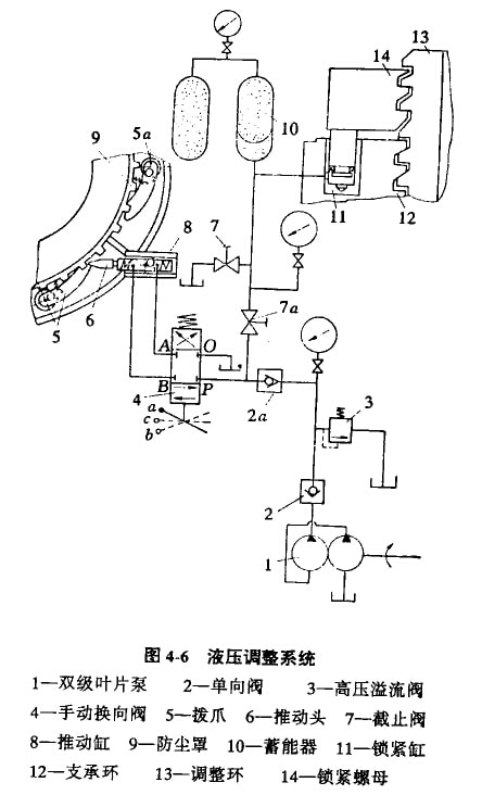 調(diào)整排料口,是靠推動缸8,通過防塵罩9的凸臺,使調(diào)整環(huán)13旋轉(zhuǎn)來實現(xiàn)。調(diào)整過程如下;首先將截止閥7打開,鎖緊缸11油壓從10MPa降至零,使調(diào)整環(huán)13與支承環(huán)12的連接螺紋放松。然后啟動14MPa壓力的雙級葉片泵1,壓力油通過單向閥2,高壓溢流閥3(即安全閥,壓力調(diào)到10MPa)和單向閥2a,進(jìn)入三位四通手動換向閥4。
