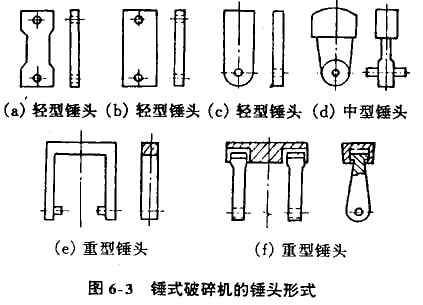 圖6-3中的(a),(b),(c)是輕型錘頭,質(zhì)量通常為3.5一15kg,多用來破碎粒度為100-200mm的軟質(zhì)相中等硬度物料,其中(a),(b)兩種兩端帶孔,磨損后可以調(diào)換4次使用,而(c)只能調(diào)換2次使用。圖6-3中的(d)為中型錘頭,質(zhì)量為30-60kg,用來破碎800mm-1000mm的中等硬度物料。圖6-3中的(e),(f)是重型錘頭,質(zhì)量達50-120kg,主要用來破碎大塊和堅硬物料。錘頭用高碳鋼鍛造或鑄造,也可用高錳鋼鑄造,為了提高耐磨性,采用高錳低合金鋼,有的在錘頭工作表面上涂焊上一層硬質(zhì)合金。近來有的用高鉻鑄鐵錘頭復合鑄造,即錘柄采用ZG45鋼,而錘頭采用高鉻鑄鐵,而耐磨性比高錳鋼錘頭提高數(shù)倍。