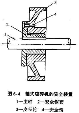 錘式破碎機的安全裝置如圖6-4所示。在破碎機的主軸上裝有安全銅套2,皮帶輪3套在銅套上,銅套與皮帶輪則用安全銷4連接,當破碎機內(nèi)進入金屬物或過負荷時,安全銷即被剪斷而起保護作用。安全銷的材質(zhì)應按規(guī)定或經(jīng)過實踐驗證,不能用強度過大的材料作安全銷,以防止進入金屬物后安全銷不斷裂,損壞其他零件和造成大的事故。