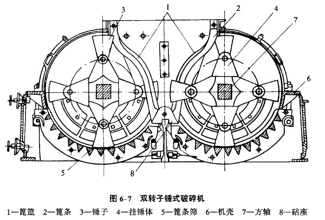 圖6-2是單轉(zhuǎn)子不可逆式錘式破碎機。它由機殼1、轉(zhuǎn)子2、篦條3、打擊板4和軸承5等部分組成。