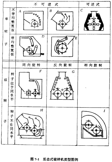 反擊式破碎機(jī)技其結(jié)構(gòu)特征,可分為單轉(zhuǎn)子和雙轉(zhuǎn)子兩種類型,其詳細(xì)類型見(jiàn)圖7-1。