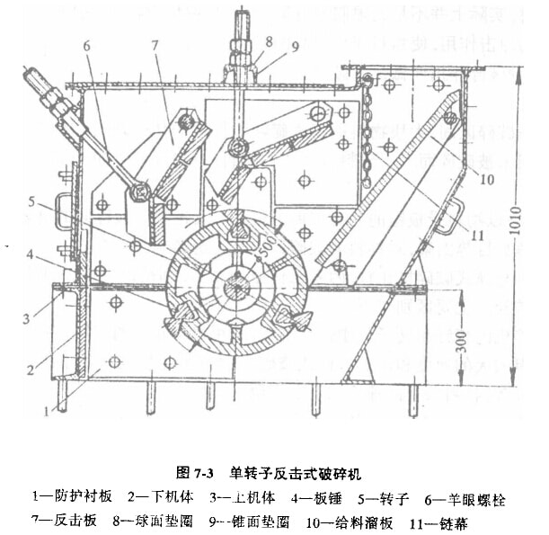 我國生產的φ500x400單轉子反擊式破碎機的構造如圖7-3所示。這種破碎機主要由上下機架、轉子、反擊板等部分組成。電動機經三角皮帶傳動使轉子高速回轉,迎著物料下落方向進行沖擊而使物料不斷破碎至小顆粒后由機體下部排出。
