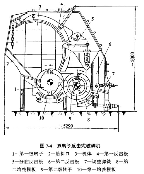 我國生產的φ1250x1250雙轉于反擊式破碎機的構造如圖7-4所示。該機具有破碎比大、生產率高、電耗少等待點。