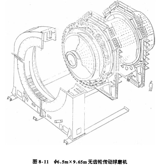 近年來,磨機在向大型化發(fā)展,即增大球磨機的筒體直徑和長度。根據(jù)生產(chǎn)實踐證實,磨機的生產(chǎn)率與簡體直徑的2.5-2.6次方成正比,因此增大筒體直徑將是磨帆今后的發(fā)展方向,但是,將磨機筒體增大到4000mm以上時,將在運輸和安裝方面帶來許多困難。隨簡體直徑的增大,而磨機合理的充填率減小,這種為了加大磨機直徑而尋求提高處理能力的辦法,是在犧牲丁球介質(zhì)充填率條件下而得到的。眾所周知,充垣率下降,磨機內(nèi)的工作介質(zhì)數(shù)員和表面積減少,出而物料受路碎的機率也減少,因此球磨機直徑加大所得的效果能公補償充填率下降的影響,是值得進一步研究的問題。目前,國外生產(chǎn)的球磨機最大規(guī)格有φ6.5x 9.65m環(huán)形定子式無齒輪傳動球磨機,其結(jié)構(gòu)如圖8-11所示。這種球磨機的轉(zhuǎn)速是亞過雙向離心變頻器控制電機供電頻率,使球磨機轉(zhuǎn)速在一個小范圍內(nèi)無級調(diào)節(jié)。可根據(jù)物料可磨性的變化自動調(diào)節(jié)磨機生產(chǎn)率。