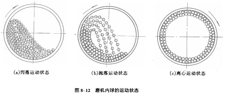 當(dāng)磨機(jī)的轉(zhuǎn)速高到某一定值時(shí),球就貼在襯板L不再落下,這種狀態(tài)稱為離心運(yùn)動(dòng)狀態(tài),如圖8-12(c)所示。發(fā)生離心運(yùn)動(dòng)狀態(tài)時(shí),物料也是貼在襯板上的。以上這些運(yùn)動(dòng)狀態(tài),都是磨機(jī)筒內(nèi)裝有一定數(shù)星球的話況下出現(xiàn)的。若磨機(jī)筒內(nèi)只有少量的球,它們只是在磨機(jī)內(nèi)攝最低點(diǎn)擺動(dòng),并不發(fā)生以上三種情況。戴維斯等人的實(shí)驗(yàn)證明,磨機(jī)內(nèi)粉磨介質(zhì)充填率小于30%一40%,而且不加水和礦砂時(shí),球均發(fā)生滑動(dòng)。綜上所述,磨機(jī)的實(shí)際上作狀態(tài)僅有瀉密狀態(tài)和拋落狀態(tài)兩種。
