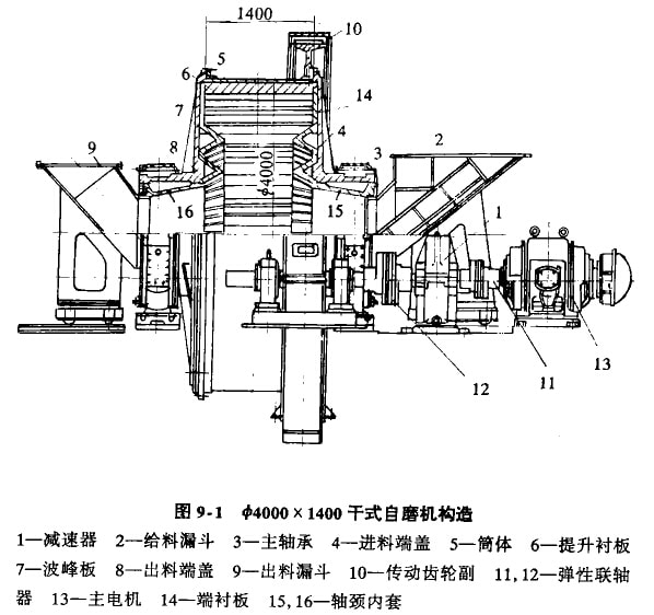 φ4000 x1400干式自磨機主機構(gòu)造如圖9-1所示。它由筒體5、主軸承3、給料漏斗2、傳動齒輪副lo、彈性聯(lián)軸器11與12、減速器1、主電機13以及集中潤滑油站等組成。