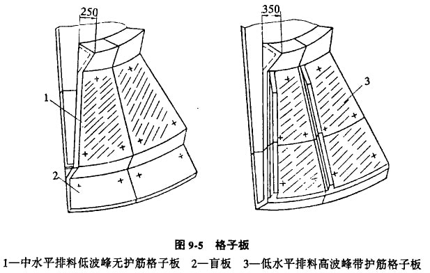 格子板如圖9-5所示;它在自磨機中不單是起排料的作用,同時還起到篩分作用;因此,格孔所處的位逞和孔隙大小都要選擇適當。格子板可分為高水平排料、中水平排料和低水平排料三種。在物料充填率45%左右的情況下,用中水平排料位貴,即可滿足排料要求,但自磨機往往會出現(xiàn)較低充填率(低于20%)的情況,就有排不出料的可能。護筋和波峰板在格子板有同樣的作用。