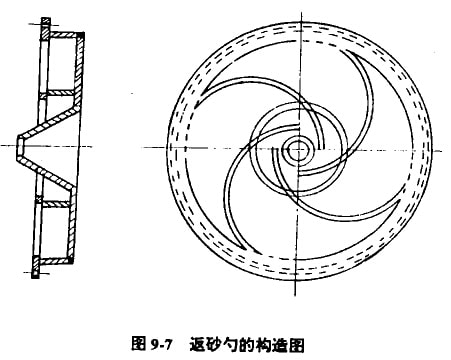 料漿通過格子板孔之后,被簸箕板送入自返裝置的篩上,大塊物料在篩面上運動到另一端的返砂勺內(nèi)。在返砂勺的回轉(zhuǎn)運動中,送入返砂管內(nèi)。返砂管內(nèi)的螺旋片,將大塊物料推送到磨機之內(nèi)再磨。篩下物沿著出料襯套排出機外,進行下道工序處理。返砂勺的構(gòu)造如圖9-7所示。