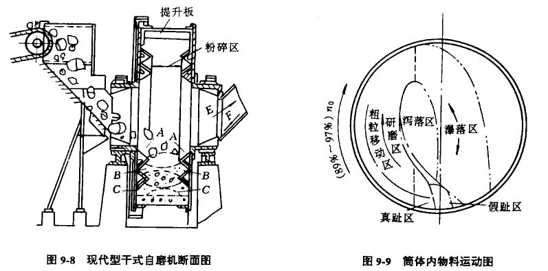 物料在自磨機(jī)筒體中的運(yùn)動(dòng)狀態(tài),除廠具有一般旋轉(zhuǎn)筒式磨機(jī)中介質(zhì)和物料的運(yùn)動(dòng)規(guī)律外,由于自磨機(jī)(主要指干式自磨機(jī))具有筒體上有提升襯板而在端蓋上有波形襯板和給料大小塊度相差很大的特殊條件,所以使得物料在自磨機(jī)筒體中的運(yùn)動(dòng)具有自己的特殊性。