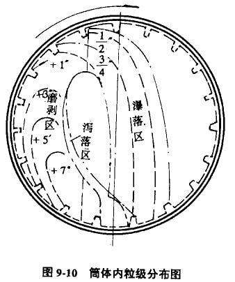 如圖9-8所示,新給料中的小粒,由給料端進(jìn)入,沿A面均勻地落于筒體底部中心,然后向兩側(cè)擴(kuò)散,大塊具有較大的動(dòng)能,總是趨向較遠(yuǎn)的一側(cè),但其中有一部分必然要和A,B面相碰,然后向另一側(cè)返問(wèn),因之,也使大塊得到均勻分布。A—A,B—B在這里的作用是防止給入物料有害的偏析。自排料端沿F面返問(wèn)的顆粒如同新給料巾的細(xì)粒一樣,均勻地落予筒體底部的中心,然后向兩邊擴(kuò)散。大塊和細(xì)粒在筒體底部沿軸向運(yùn)動(dòng),方向正好相反。于是產(chǎn)生粉磨作用。