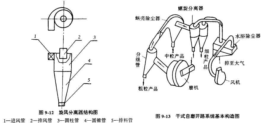 目前干式自磨機(jī)采用的風(fēng)力運(yùn)送分級(jí)系統(tǒng)有兩種:閉路系統(tǒng)和開(kāi)路系統(tǒng)。我國(guó)采用干式自磨機(jī)的廠礦,在生產(chǎn)實(shí)踐中結(jié)合自己的具體條件對(duì)管路系統(tǒng)進(jìn)行了不少的改進(jìn)。所以風(fēng)力運(yùn)送分級(jí)管路系統(tǒng)的構(gòu)造并不完全相同。圖9-11介紹的是閉路系統(tǒng)的基本構(gòu)造,圖中沒(méi)有標(biāo)注數(shù)字的圓筒表示磨帆,右邊是給料端,左邊是排料端,2表示粗粉分級(jí)器(目前多用沉降箱),沉降箱是鋼板焊成的長(zhǎng)方體,臥式的長(zhǎng)寬較大而高度較;立式的則高度較大,長(zhǎng)寬鉸小,有的與風(fēng)流方向相垂直的斷面上還沒(méi)有隔板。粗粉分級(jí)器與磨饑排料漏斗之間用風(fēng)管連通,在粗粉分離器中,粗粒的粉磨產(chǎn)品被分離出來(lái)。3表示細(xì)粉分離器(圖示兩臺(tái)并聯(lián)的旋風(fēng)分離器)。旋風(fēng)分離器的結(jié)構(gòu)如圖9-12所示。它由一段圓柱管3與一段圓錐管4構(gòu)成外筒,在圓柱管的上方有蝸殼形的進(jìn)風(fēng)管1,進(jìn)風(fēng)管斷面為方形,外筒巾心靠k部有較短的排風(fēng)管2。錐管的下端有排料管5。